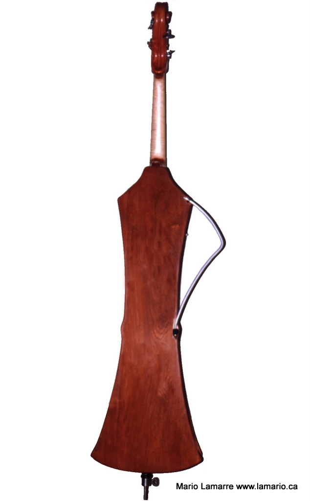 Le manche démontable permet aussi la mise de hauteur des cordes à la touche. L'épaule est une tige d'aluminium qui s'incline et qui se remet. Le cheviller est d'un design particulier pour cette basse.