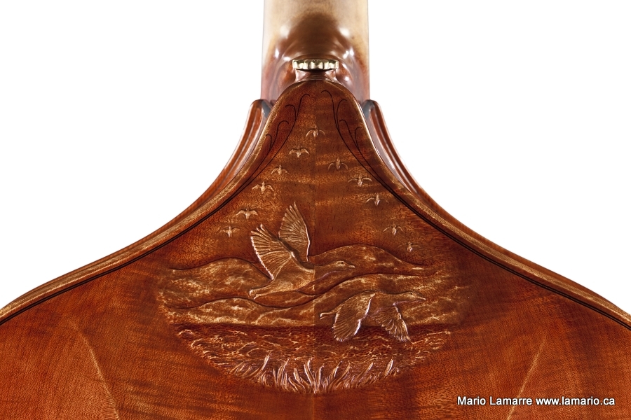 (8) Detail of the bottom low relief symbolising the taking fly of a snow goose couple from Montmagny, Quebec toward the Canadian Far North. Higher purflings are opened and greet the passage of these great travellers without border.