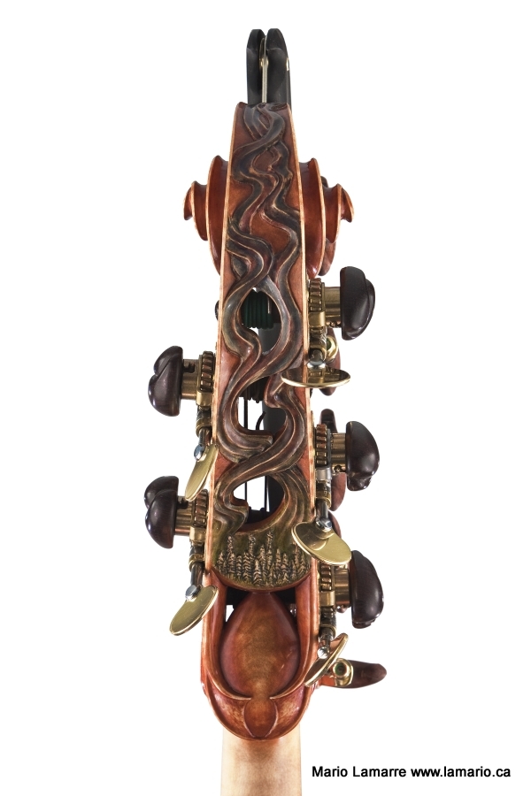 (4) The empty space between the extension and the peg box represents birds’ flight. Capos have been made of egg shape and those capos have become birds in state of meditation. Detachable tuning pegs bouts of egg shape represent life at the beginning of cell division. The extension extremity with bird head form is a homage to the mystic of Inuit Canadian Far North.